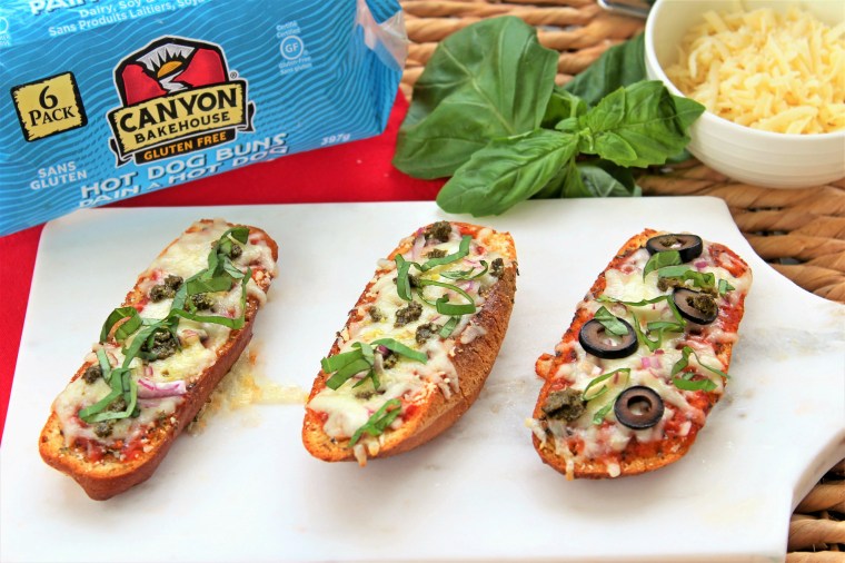 It was lunch time, and I was at a bit of a loss as far as what I should make. I had mozzarella, sauce, and some toppings on hand to make pizza, but I was lacking the flour (and time) needed to make pizza dough. So I went downstairs to my freezer, and there I saw a package of gluten free hot dog buns. “Why not turn these into pizza?”. Sounded a little strange to me, but you know what? It totally worked.