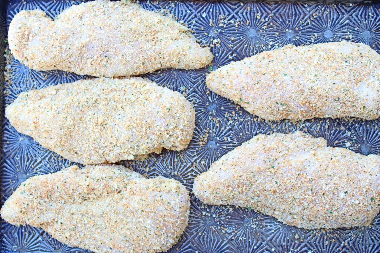 First of all, this dish is incredibly easy to make. These chicken breasts are coated in a simple mixture of my favorite gluten free breadcrumbs, grated parmesan cheese, sea salt, and dried Italian seasoning. They cook up in 30-40 minutes with little mess and no fuss. I also love that I can prep these chicken breasts in advance. Simply place the prepared chicken breasts in a baking dish or rimmed baking sheet, cover, and refrigerate until you’re ready to start dinner (just be sure you cook them on the same day that you prep them).