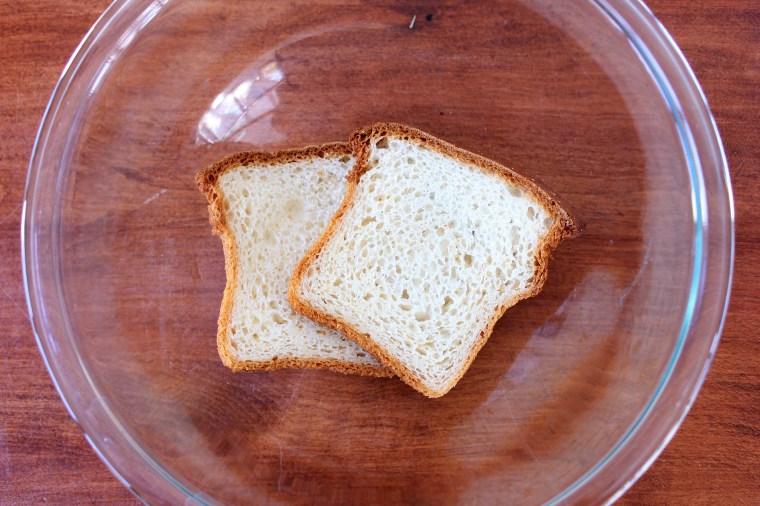 - Select two slices of your favorite gluten free bread. I typically use either Canyon Bakehouse’s Mountain White or Three Bakers White Bread. Moisten up the bread. Begin by adding 1/4 cup of milk to the bread. Pour the milk directly over the bread and allow it to soak in for 5 minutes.