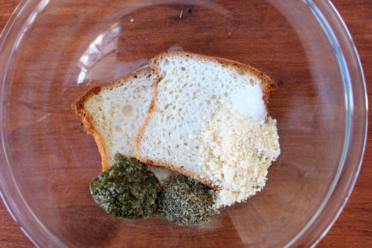 - Add 2 tablespoons of grated parmesan cheese, 1/4 teaspoon salt, 1 tablespoon dried Italian seasoning, and 1 tablespoon prepared pesto (optional). Using a fork or your hands, mash all of the ingredients together. You want the bread to be broken down completely, paying extra attention to the crusts which may require a little extra mashing.