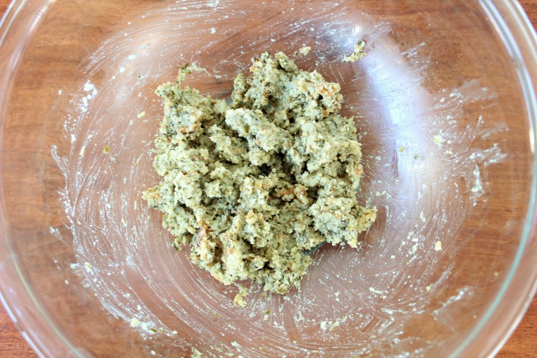 Then add 2 tablespoons of grated parmesan cheese, 1/4 teaspoon salt, 1 tablespoon dried Italian seasoning, and 1 tablespoon prepared pesto (optional). Using a fork or your hands, mash all of the ingredients together. You want the bread to be broken down completely, paying extra attention to the crusts which may require a little extra mashing.