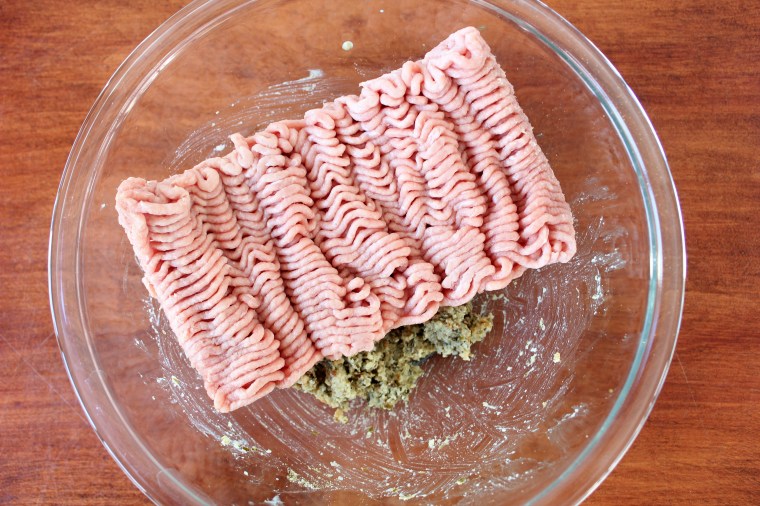 Using either a fork or your hands, combine the meat and the bread mixture together. You want to be sure not to overmix the two. Overmixing will produce a gummy, tacky mixture that will yield tough meatballs. Simply fold the two together until the bread mixture is evenly distributed throughout the meat and both hold together.