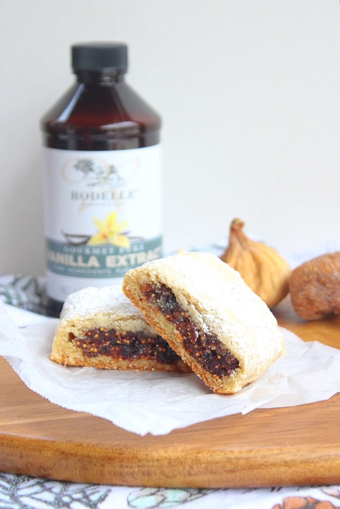 – While the dough is chilling, make the fig filling. Remove the stems from the dried figs. Cut the figs into small pieces to yield 2 cups. Add one cup of cranberries, 2 tablespoons sugar, 1 teaspoon vanilla extract, and 1/3 cup water to a sauce pan. Bring to a simmer and allow to cook for 5-7 minutes. Be sure to stir frequently to prevent sticking or burning. Place the fruit mixture into the bowl of a food processor. Add in one teaspoon of vanilla paste. Pulse until smooth.