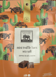 I was gifted with a lovely box of chocolates from Endangered Species.  No one has to twist my arm to try chocolate.  And while this may be a stretch to qualify as a snack, my favorite item from the box were these luxurious truffles.  They were amazing.  Seriously, they were the best chocolates I’ve had.  I am not sure which one I liked better the Sea Salt or the Milk.  A really delicious treat is also their dip n’ joy packs.  These feature their chocolate batons and a dipping sauce.  If you want a decadent treat, check out all that Endangered Species has to offer. I don’t have pictures because the extreme heat in my area was not kind to the chocolate, but I assure you, you will not be disappointed. These truffles are literally on my Christmas wish list.