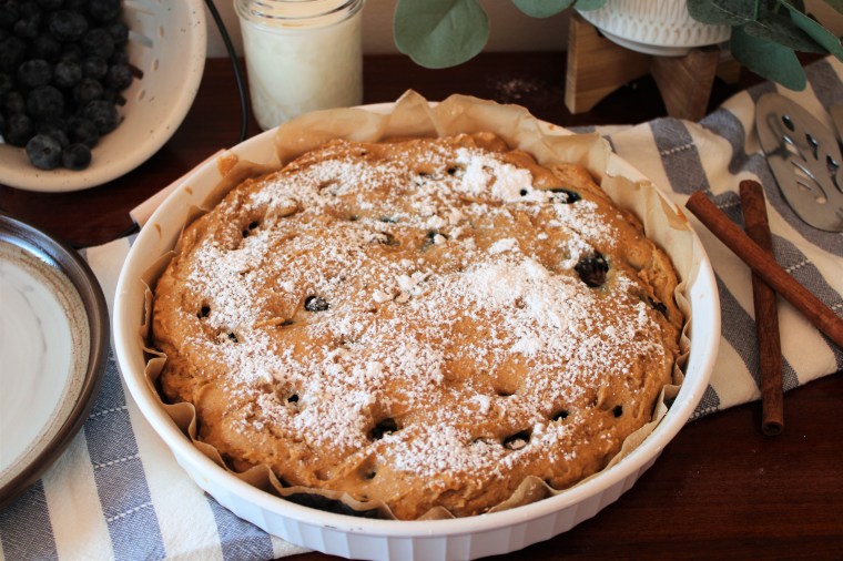 I’ve also added cinnamon to the recipe. The blueberries, buttermilk, and cinnamon work really well together. It’s a bit of an unexpected flavor, but unexpected in a great way. You can certainly eat this cake plain, but I really love adding a dollop of whipped cream to the top along with a sprinkle of crunchy granola.