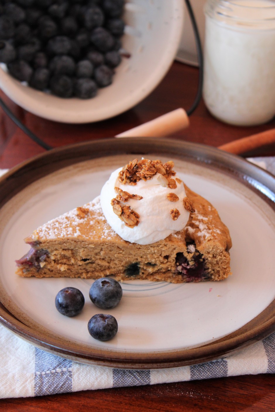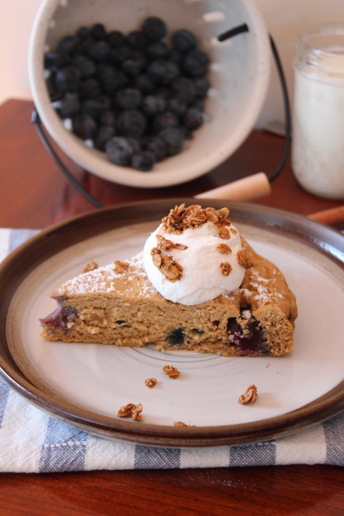 I’ve also added cinnamon to the recipe.  The blueberries, buttermilk, and cinnamon work really well together.  It’s a bit of an unexpected flavor, but unexpected in a great way.  You can certainly eat this cake plain, but I really love adding a dollop of whipped cream to the top along with a sprinkle of crunchy granola.