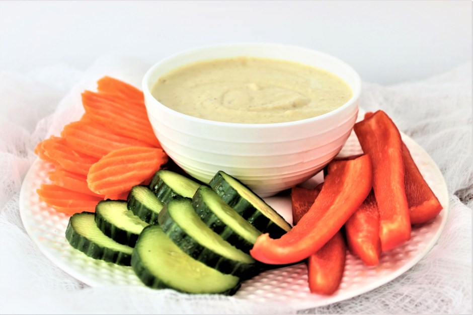 This dip can be used as a healthy alternative to mayo on any sandwich, a dipping “sauce” for homemade chicken fingers (as my kids love to do), or as pictured below, the perfect little lunch plate. You want to talk about a totally guilt free lunch – this is it.